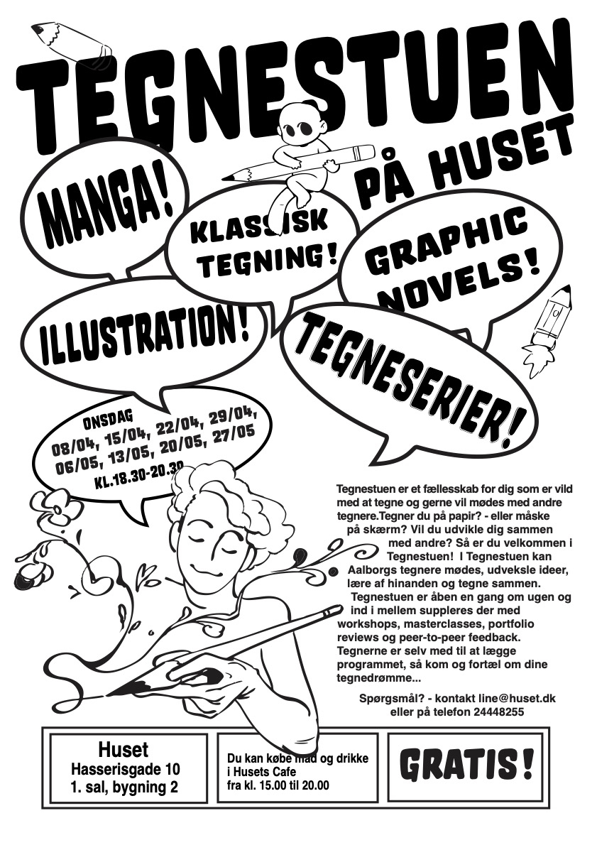 Tegnestuen er åben en gang om ugen og ind i mellem suppleres der med workshops, masterclasses, portfolio reviews og peer-to-peer feedback. Tegnerne er med til at lægge programmet, så kom og fortæl om dine tegnedrømme...